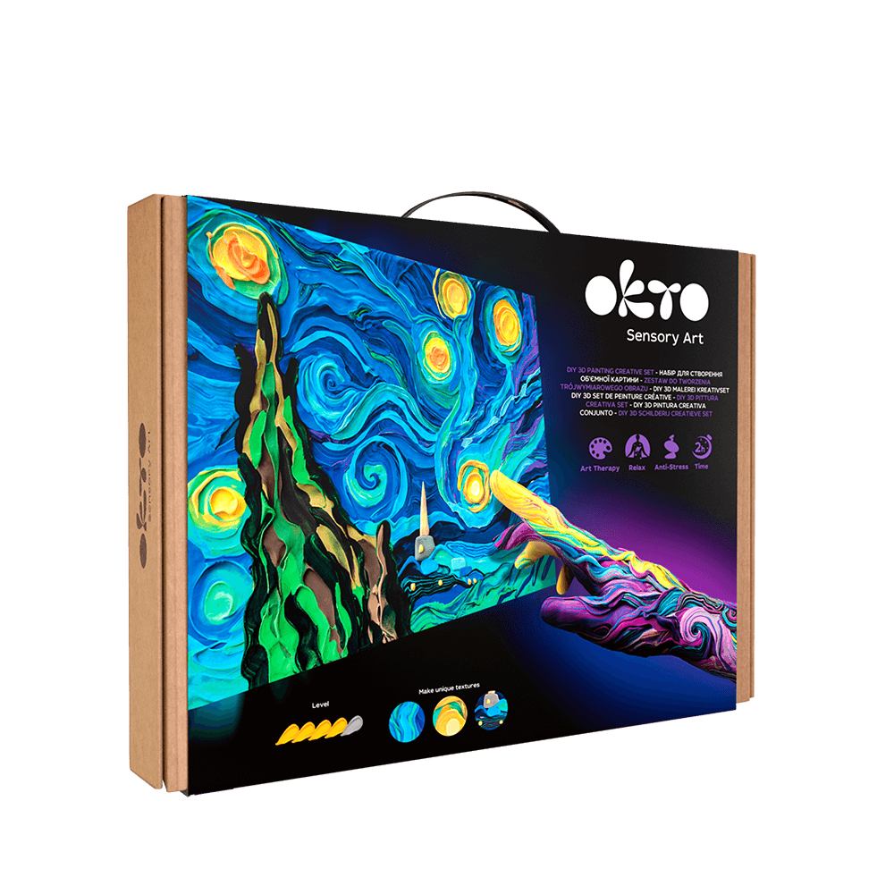 Tauche ein in diese behagliche Atmosphäre mit dem Set von OKTO, das dir hilft, das berühmte Gemälde von Van Gogh genau so wiederzugeben, wie du es fühlst.